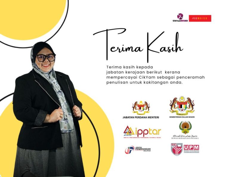 CikYam faham bukan semua orang ada masa untuk duduk menulis. Serahkan pada yang pakar. CikYam boleh bantu hasilkan ayat memukau untuk anda. CikYam juga jurulatih penulisan bertauliah. Perlukan penulisan atau bengkel penulisan, CikYam sedia membantu.